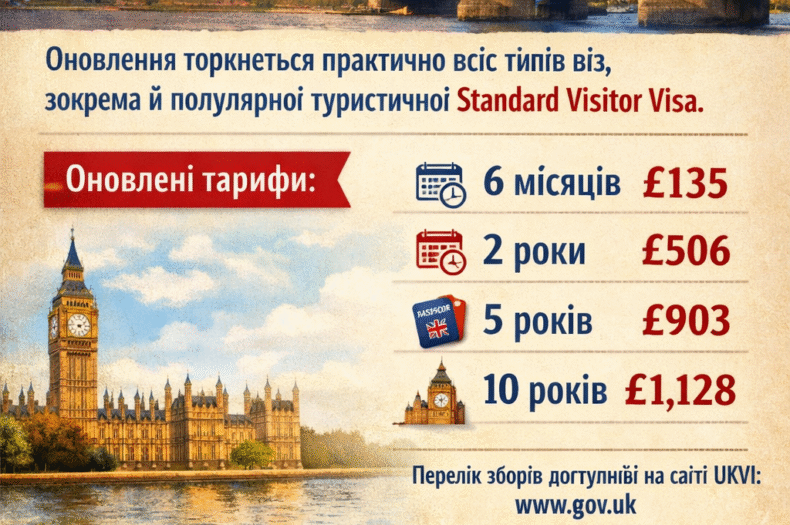 Оновлення торкнеться практично всіх категорій віз, включно з популярною туристичною Standard Visitor Visa, якою користуються для короткострокових поїздок до Великої Британії — як з метою туризму, так і для відвідування родичів або ділових поїздок.