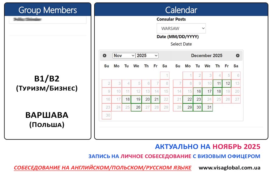 Календарь записи на туристическую визу B1/B2 в Варшаве и Кракове